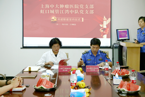 上海中大肿瘤医院党支部代表与虹口城管江湾中队相关负责人开展交流座谈,就进一步加强共建联建、整合资源、共同发展等工作内容进行探讨,并签署了《共建联建协议书》,双方党支部负责人分别代表单位在协议上签字。
